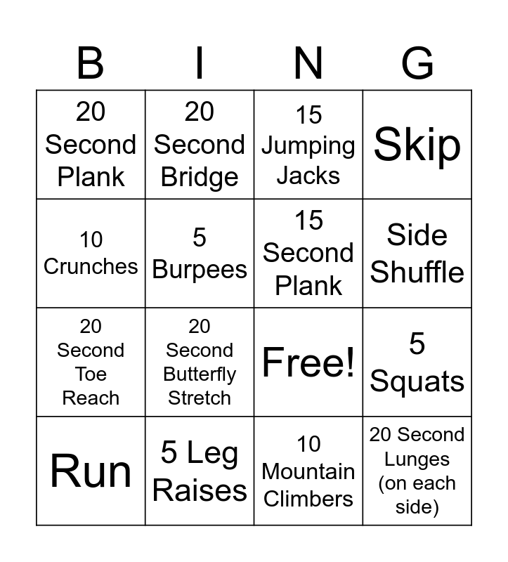 This bingo card has 19 words: Free!, 5 Pushups, 15 Jumping Jacks, 20 Second Lunges (on each side), 5 Squats, 10 Crunches, 10 Mountain Climbers, 20 Second Plank, 20 Second Bridge, 20 Second Toe Reach, 20 Second Butterfly Stretch, 5 Burpees, 15 Second Plank, 5 Leg Raises, Run, Frankenstein, Skip, Side Shuffle and Move and Lunge.