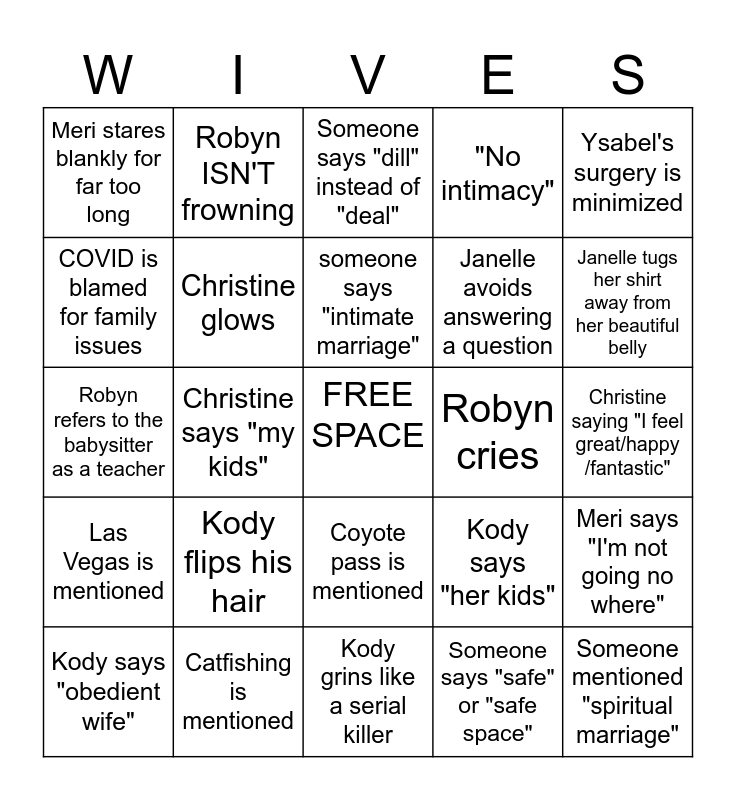 This bingo card has a free space and 24 words: Kody flips his hair, Catfishing is mentioned, someone says "intimate marriage", Kody says "obedient wife", Ysabel's surgery is minimized, Meri stares blankly for far too long, COVID is blamed for family issues, Robyn ISN'T frowning, Robyn cries, Coyote pass is mentioned, Janelle avoids answering a question, Robyn refers to the babysitter as a teacher, Kody says "her kids", Meri says "I'm not going no where", Christine glows, Someone says "safe" or "safe space", Christine saying "I feel great/happy /fantastic", Someone says "dill" instead of "deal", Janelle tugs her shirt away from her beautiful belly, Christine says "my kids", Someone mentioned "spiritual marriage", Las Vegas is mentioned, "No intimacy" and Kody grins like a serial killer.