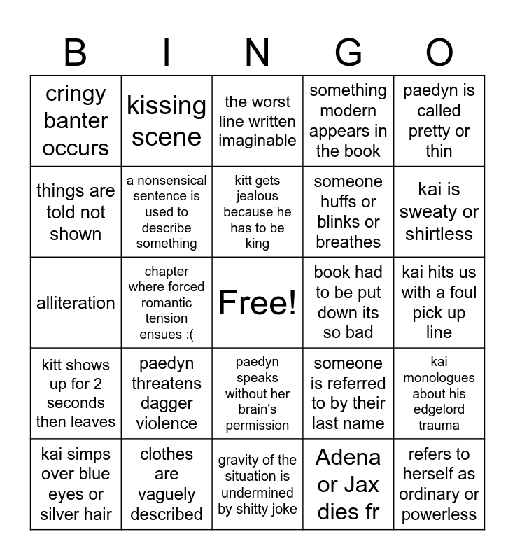 This bingo card has a free space and 24 words: paedyn threatens dagger violence, clothes are vaguely described, kitt gets jealous because he has to be king, kai simps over blue eyes or silver hair, paedyn is called pretty or thin, cringy banter occurs, things are told not shown, kissing scene, book had to be put down its so bad, paedyn speaks without her brain's permission, someone huffs or blinks or breathes, alliteration, someone is referred to by their last name, kai monologues about his edgelord trauma, a nonsensical sentence is used to describe something, Adena or Jax dies fr, kai hits us with a foul pick up line, the worst line written imaginable, kai is sweaty or shirtless, chapter where forced romantic tension ensues :(, refers to herself as ordinary or powerless, kitt shows up for 2 seconds then leaves, something modern appears in the book and gravity of the situation is undermined by shitty joke.