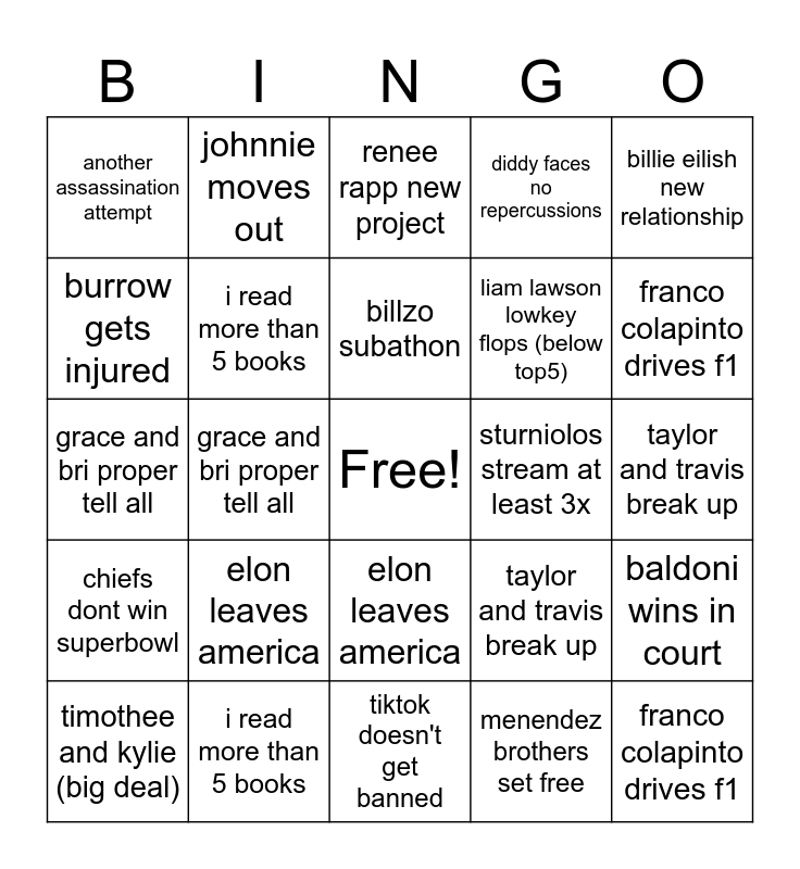 This bingo card has a free space and 48 words: tomdaya engagement, franco colapinto drives f1, timothee and kylie (big deal), tiktok doesn't get banned, elon leaves america, chiefs dont win superbowl, johnnie moves out, caitibuggzz comes back, burrow gets injured, nj devils go to playoffs, i read more than 5 books, diddy faces no repercussions, baldoni wins in court, taylor and travis break up, i get my first kiss, minecraft movie surprisingly does not too bad, billzo subathon, sturniolos stream at least 3x, renee rapp new project, billie eilish new relationship, grace and bri proper tell all, menendez brothers set free, another assassination attempt, liam lawson lowkey flops (below top5), tomdaya engagement, franco colapinto drives f1, timothee and kylie (big deal), tiktok doesn't get banned, elon leaves america, chiefs dont win superbowl, johnnie moves out, caitibuggzz comes back, burrow gets injured, nj devils go to playoffs, i read more than 5 books, diddy faces no repercussions, baldoni wins in court, taylor and travis break up, i get my first kiss, minecraft movie surprisingly does not too bad, billzo subathon, sturniolos stream at least 3x, renee rapp new project, billie eilish new relationship, grace and bri proper tell all, menendez brothers set free, another assassination attempt and liam lawson lowkey flops (below top5).