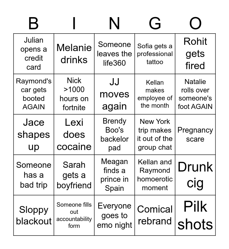 This bingo card has a free space and 24 words: Sarah gets a boyfriend, Someone fills out accountability form, JJ moves again, Sloppy blackout, Rohit gets fired, Julian opens a credit card, Raymond's car gets booted AGAIN, Melanie drinks, New York trip makes it out of the group chat, Meagan finds a prince in Spain, Kellan makes employee of the month, Jace shapes up, Kellan and Raymond homoerotic moment, Drunk cig, Nick >1000 hours on fortnite, Comical rebrand, Pregnancy scare, Someone leaves the life360, Natalie rolls over someone's foot AGAIN, Lexi does cocaine, Pilk shots, Someone has a bad trip, Sofia gets a professional tattoo and Everyone goes to emo night.