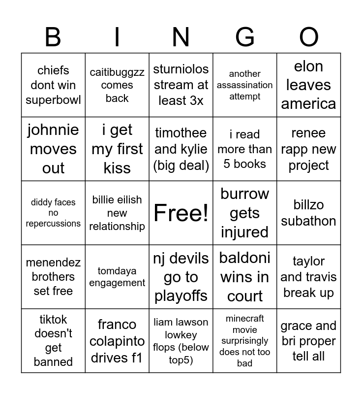 This bingo card has a free space and 24 words: tomdaya engagement, franco colapinto drives f1, timothee and kylie (big deal), tiktok doesn't get banned, elon leaves america, chiefs dont win superbowl, johnnie moves out, caitibuggzz comes back, burrow gets injured, nj devils go to playoffs, i read more than 5 books, diddy faces no repercussions, baldoni wins in court, taylor and travis break up, i get my first kiss, minecraft movie surprisingly does not too bad, billzo subathon, sturniolos stream at least 3x, renee rapp new project, billie eilish new relationship, grace and bri proper tell all, menendez brothers set free, another assassination attempt and liam lawson lowkey flops (below top5).