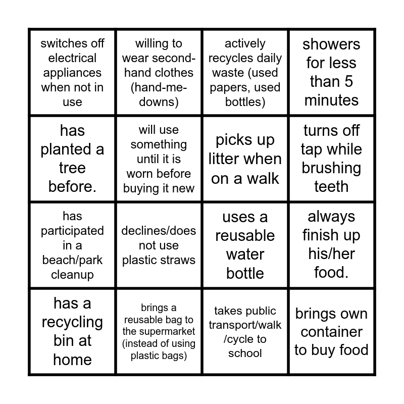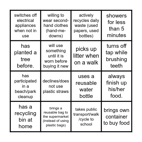 This bingo card has 16 words: brings a reusable bag to the supermarket (instead of using plastic bags), always finish up his/her food., actively recycles daily waste (used papers, used bottles), switches off electrical appliances when not in use, has participated in a beach/park cleanup, willing to wear second-hand clothes (hand-me-downs), uses a reusable water bottle, takes public transport/walk /cycle to school, has planted a tree before., will use something until it is worn before buying it new, has a recycling bin at home, showers for less than 5 minutes, declines/does not use plastic straws, turns off tap while brushing teeth, picks up litter when on a walk and brings own container to buy food.