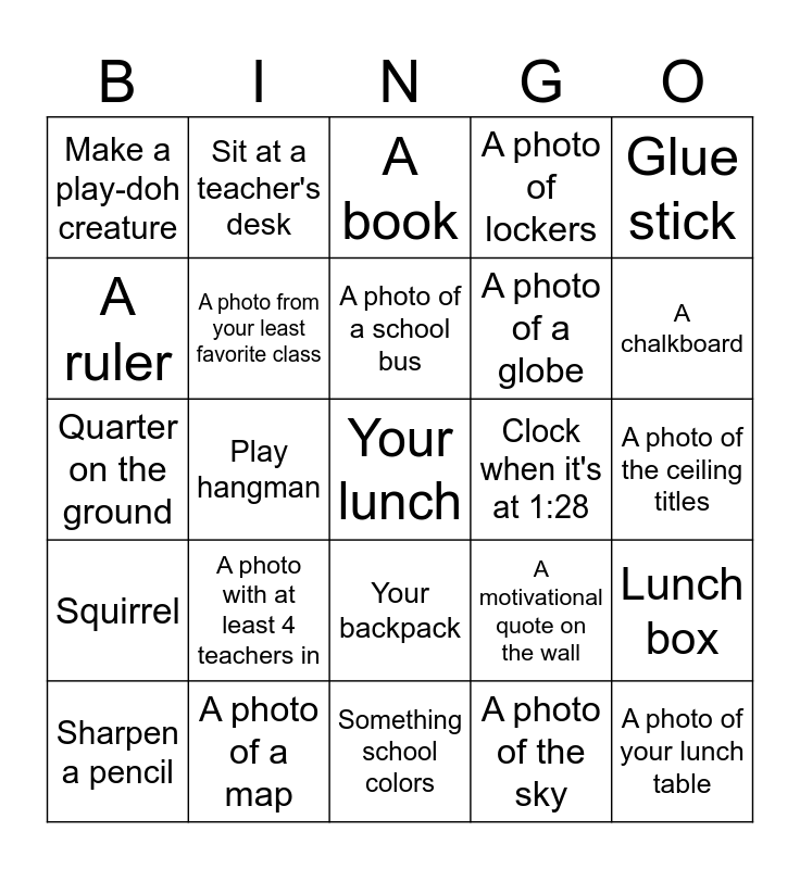 This bingo card has a free space and 24 words: A photo with at least 4 teachers in, A photo of a map, A photo of a school bus, Sharpen a pencil, Glue stick, Make a play-doh creature, A ruler, Sit at a teacher's desk, Clock when it's at 1:28, Your backpack, A photo of a globe, Quarter on the ground, A motivational quote on the wall, Lunch box, A photo from your least favorite class, A photo of the sky, A photo of the ceiling titles, A book, A chalkboard, Play hangman, A photo of your lunch table, Squirrel, A photo of lockers and Something school colors.