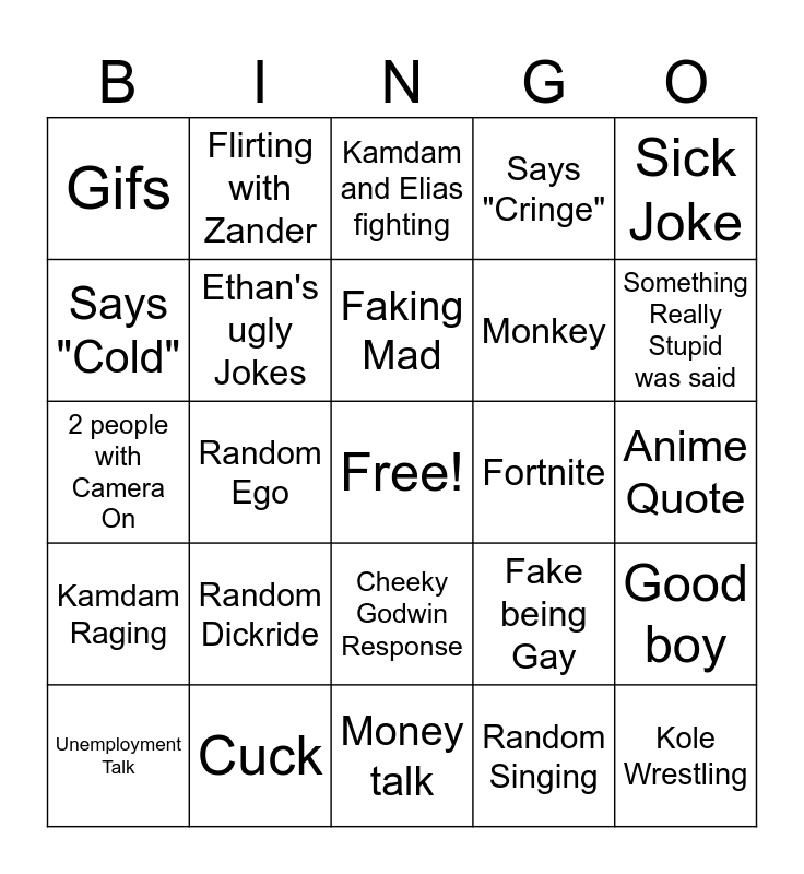 This bingo card has a free space and 24 words: Random Dickride, Cuck, Faking Mad, Unemployment Talk, Sick Joke, Gifs, Says "Cold", Flirting with Zander, Fortnite, Cheeky Godwin Response, Monkey, 2 people with Camera On, Fake being Gay, Good boy, Ethan's ugly Jokes, Random Singing, Anime Quote, Kamdam and Elias fighting, Something Really Stupid was said, Random Ego, Kole Wrestling, Kamdam Raging, Says "Cringe" and Money talk.