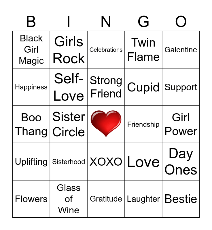This bingo card has a free space and 29 words: Flowers, Empowerment, Sister Circle, Dance Party, Black Girl Magic, Celebrations, Self-Love, Sisterhood, Friendship, Glass of Wine, Girl Power, Bestie, Gratitude, Laughter, Support, Soul Sister, XOXO, Uplifting, Galentine, Boo Thang, Love, Girls' Brunch, Cupid, Happiness, Twin Flame, Girls Rock, Day Ones, Strong Friend and Sweetheart.