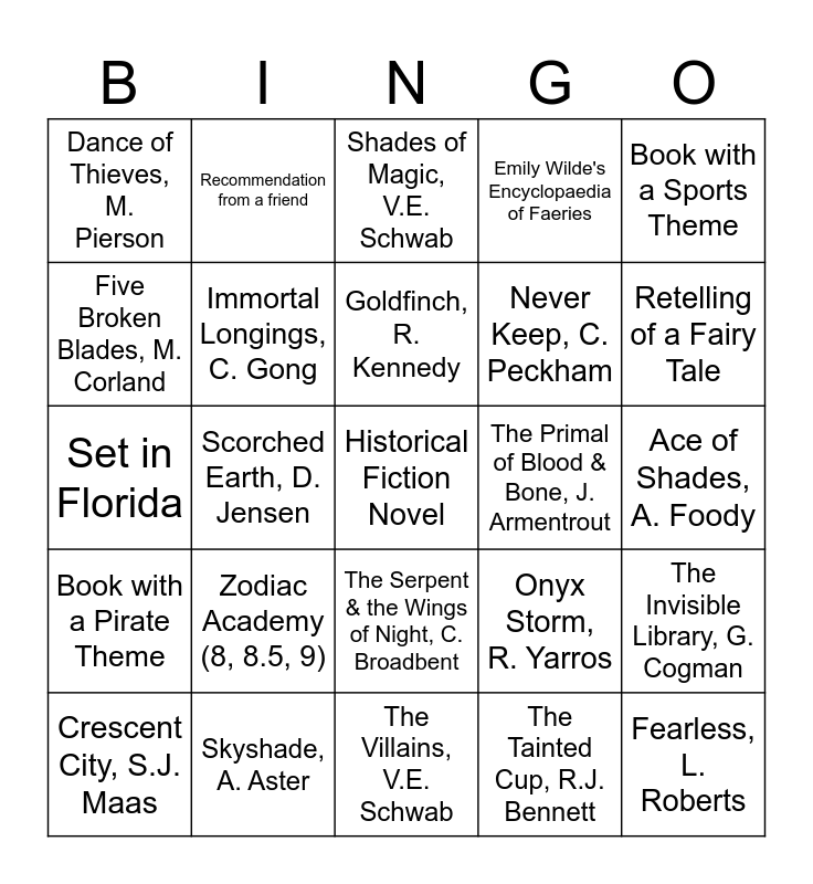 This bingo card has 25 words: Zodiac Academy (8, 8.5, 9), The Villains, V.E. Schwab, Goldfinch, R. Kennedy, Crescent City, S.J. Maas, Book with a Sports Theme, Dance of Thieves, M. Pierson, Five Broken Blades, M. Corland, Recommendation from a friend, The Primal of Blood & Bone, J. Armentrout, The Serpent & the Wings of Night, C. Broadbent, Never Keep, C. Peckham, Set in Florida, Onyx Storm, R. Yarros, The Invisible Library, G. Cogman, Immortal Longings, C. Gong, Fearless, L. Roberts, Ace of Shades, A. Foody, Shades of Magic, V.E. Schwab, Retelling of a Fairy Tale, Scorched Earth, D. Jensen, Historical Fiction Novel, Skyshade, A. Aster, Book with a Pirate Theme, Emily Wilde's Encyclopaedia of Faeries and The Tainted Cup, R.J. Bennett.