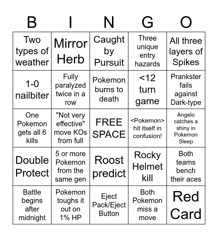 This bingo card has a free space and 34 words: 6-0 sweep, Both Pokemon miss a move, Game lasts over an hour, 1-pointer gets a kill, Double Protect, Fully paralyzed twice in a row, All three layers of Spikes, Battle begins after midnight, Mirror Herb, Trick Room, Pokemon burns to death, Caught by Pursuit, Counter/Mirror Coat, A move runs out of PP, <Pokemon> hit itself in confusion!, Prankster fails against Dark-type, Pokemon toughs it out on 1% HP, One Pokemon gets all 6 kills, 5 or more Pokemon from the same gen, Rocky Helmet kill, Roost predict, Pokemon gets frozen (and thaws immediately), Two types of weather, Angelo catches a shiny in Pokemon Sleep, Eject Pack/Eject Button, Red Card, Three unique entry hazards, Focus Blast actually hits, <12 turn game, 1-0 nailbiter, Turn 1 KO, "Not very effective" move KOs from full, Both teams bench their aces and Ace dies before clicking a move.