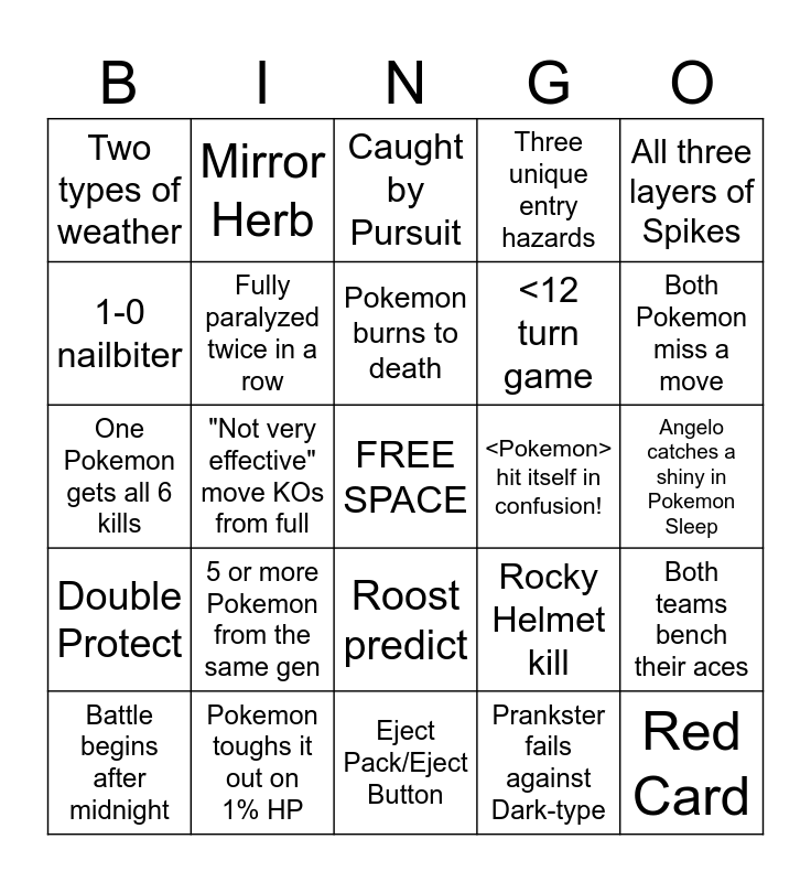 This bingo card has a free space and 34 words: 6-0 sweep, Prankster fails against Dark-type, Game lasts over an hour, 1-pointer gets a kill, Double Protect, Fully paralyzed twice in a row, All three layers of Spikes, Battle begins after midnight, Mirror Herb, Trick Room, Pokemon burns to death, Caught by Pursuit, Counter/Mirror Coat, A move runs out of PP, <Pokemon> hit itself in confusion!, Both Pokemon miss a move, Pokemon toughs it out on 1% HP, One Pokemon gets all 6 kills, 5 or more Pokemon from the same gen, Rocky Helmet kill, Roost predict, Pokemon gets frozen (and thaws immediately), Two types of weather, Angelo catches a shiny in Pokemon Sleep, Eject Pack/Eject Button, Red Card, Three unique entry hazards, Focus Blast actually hits, <12 turn game, 1-0 nailbiter, Turn 1 KO, "Not very effective" move KOs from full, Both teams bench their aces and Ace dies before clicking a move.