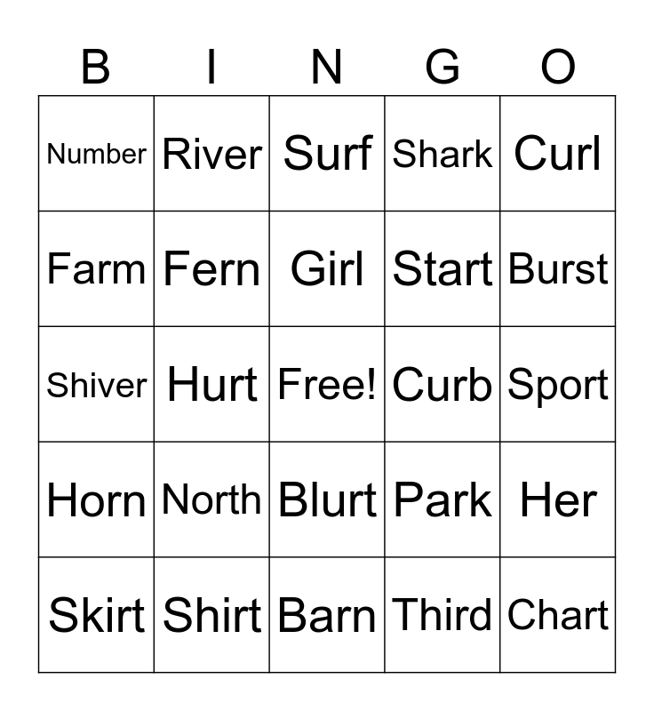 This bingo card has a free space and 34 words: Fort, Third, First, Perch, Horn, Fern, Curl, Skirt, River, Short, Girl, Surf, After, Torch, Curb, Burst, Shirt, Shiver, North, Park, Blurt, Chirp, Number, Sport, Barn, Chart, Shark, Scarf, Start, Farm, Fur, Hurt, Her and For.