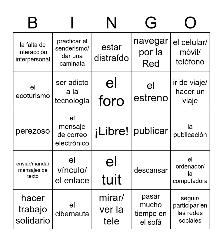 This bingo card has a free space and 41 words: jugar afuera, perezoso, la falta de actividad física, ser adicto a la tecnología, el cibernauta, el tuit, el foro, el ciberacoso, el celular/ móvil/ teléfono, enviar/mandar mensajes de texto, el mensaje de correo electrónico, navegar por la Red, seguir/ participar en las redes sociales, la publicación, publicar, el vínculo/ el enlace, la app, la falta de interacción interpersonal, las habilidades sociales deficientes, estar distraído, el ordenador/ la computadora, el aparato/ el dispositivo, mirar/ ver la tele, el estreno, estar enganchado a la tele, jugar a los videojuegos, pasar mucho tiempo en el sofá, ir de vacaciones, ir de viaje/ hacer un viaje, acampar/ hacer camping/ ir de camping, armar una tienda de campaña, practicar el senderismo/ dar una caminata, hacer trabajo solidario, relajarse, descansar, el ecoturismo, navegar en rápidos, la selva/ el bosque tropical/ el bosque lluvioso, hacer canopy, broncearse/ tomar el sol and bucear con tubo en el mar/ hacer esnórquel.