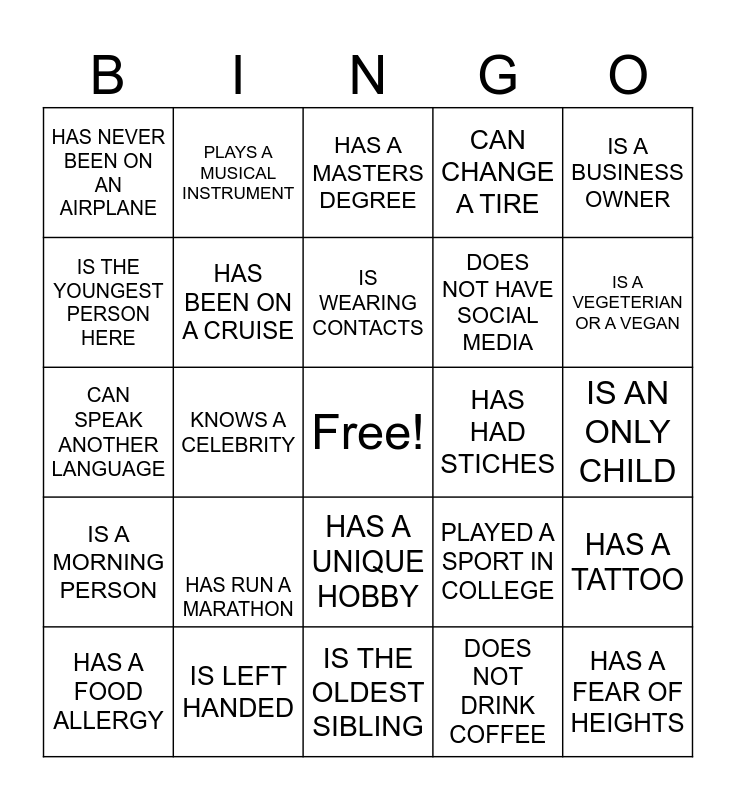 This bingo card has a free space and 24 words: HAS RUN A MARATHON, IS LEFT HANDED, IS WEARING CONTACTS, HAS A FOOD ALLERGY, IS A BUSINESS OWNER, HAS NEVER BEEN ON AN AIRPLANE, IS THE YOUNGEST PERSON HERE, PLAYS A MUSICAL INSTRUMENT, HAS HAD STICHES, HAS A UNIQUE HOBBY, DOES NOT HAVE SOCIAL MEDIA, CAN SPEAK ANOTHER LANGUAGE, PLAYED A SPORT IN COLLEGE, HAS A TATTOO, HAS BEEN ON A CRUISE, DOES NOT DRINK COFFEE, IS AN ONLY CHILD, HAS A MASTERS DEGREE, IS A VEGETERIAN OR A VEGAN, KNOWS A CELEBRITY, HAS A FEAR OF HEIGHTS, IS A MORNING PERSON, CAN CHANGE A TIRE and IS THE OLDEST SIBLING.