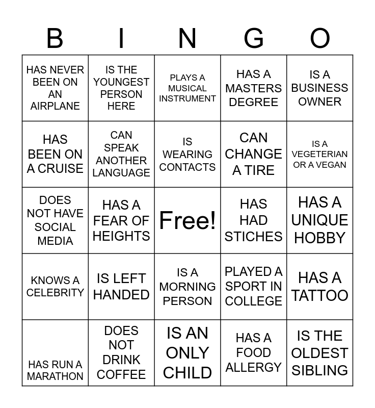 This bingo card has a free space and 24 words: HAS RUN A MARATHON, IS LEFT HANDED, IS WEARING CONTACTS, HAS A FOOD ALLERGY, IS A BUSINESS OWNER, HAS NEVER BEEN ON AN AIRPLANE, IS THE YOUNGEST PERSON HERE, PLAYS A MUSICAL INSTRUMENT, HAS HAD STICHES, HAS A UNIQUE HOBBY, DOES NOT HAVE SOCIAL MEDIA, CAN SPEAK ANOTHER LANGUAGE, PLAYED A SPORT IN COLLEGE, HAS A TATTOO, HAS BEEN ON A CRUISE, DOES NOT DRINK COFFEE, IS AN ONLY CHILD, HAS A MASTERS DEGREE, IS A VEGETERIAN OR A VEGAN, KNOWS A CELEBRITY, HAS A FEAR OF HEIGHTS, IS A MORNING PERSON, CAN CHANGE A TIRE and IS THE OLDEST SIBLING.