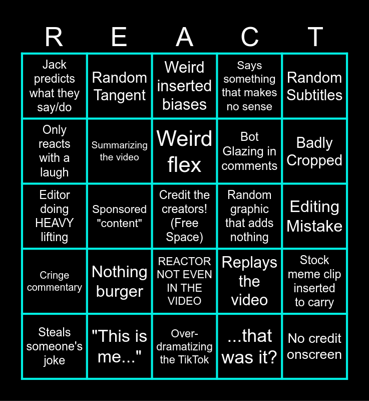 This bingo card has 37 words: Forgets to React, Freebooting a freebooted video, Shaky Cam, Summarizing the video, Stock meme clip inserted to carry, Nothing burger, Weird flex, Talking over the person in the video, Random Subtitles, Unneeded sound effect, Sponsored "content", Says something that makes no sense, Credit the creators! (Free Space), Editing Mistake, Only reacts with a laugh, Cringe commentary, TikTok doesn't match the title, Weird inserted biases, REACTOR NOT EVEN IN THE VIDEO, Random graphic that adds nothing, Jack predicts what they say/do, Badly Cropped, Steals someone's joke, Over-dramatizing the TikTok, Actual insight, ...that was it?, Random Tangent, Just quotes the OG video, Bullies person in video, Very loud, No links in description, "This is me...", Editor doing HEAVY lifting, No credit onscreen, Replays the video, Bot Glazing in comments and ReactBot's reaction is better.