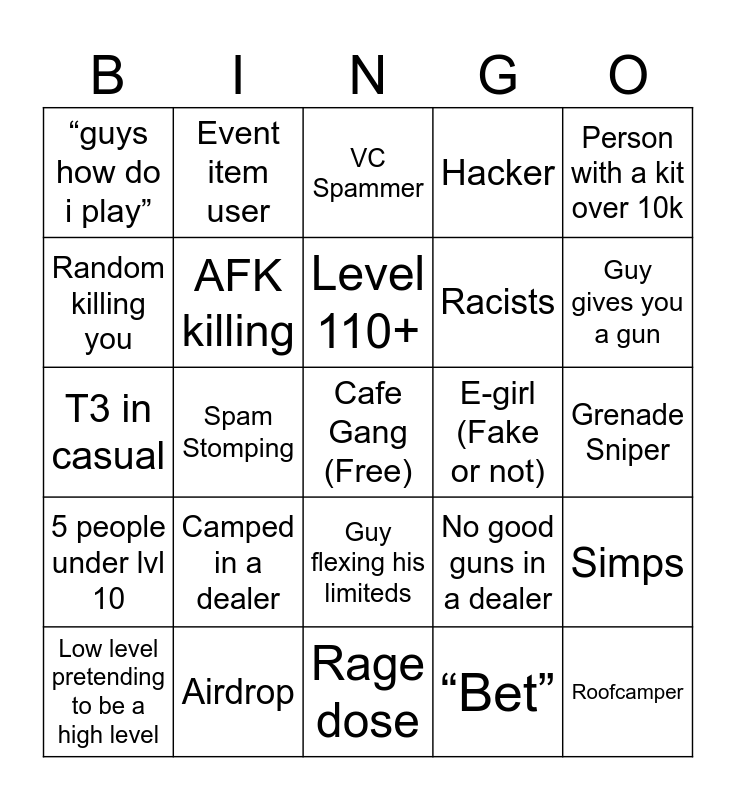 This bingo card has a free space and 24 words: Camped in a dealer, Airdrop, Level 110+, Low level pretending to be a high level, Person with a kit over 10k, “guys how do i play”, Random killing you, Event item user, E-girl (Fake or not), Guy flexing his limiteds, Racists, T3 in casual, No good guns in a dealer, Simps, AFK killing, “Bet”, Grenade Sniper, VC Spammer, Guy gives you a gun, Spam Stomping, Roofcamper, 5 people under lvl 10, Hacker and Rage dose.