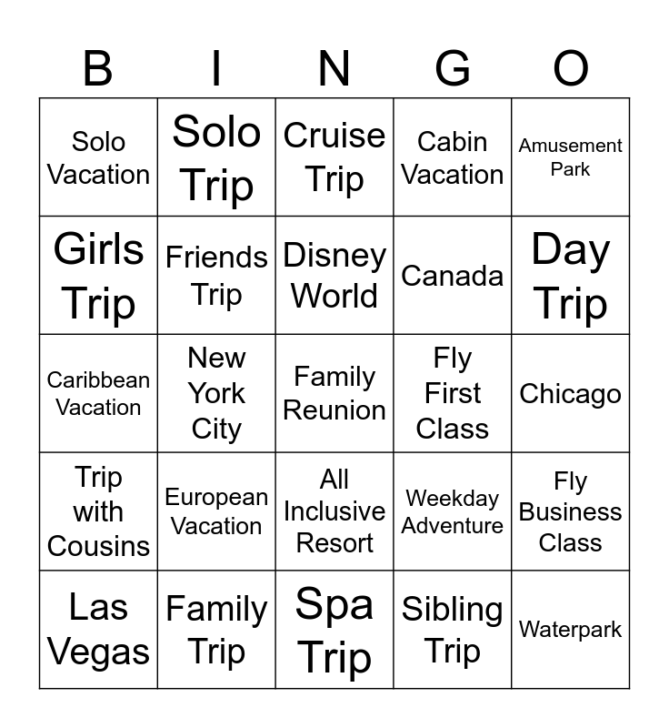 This bingo card has 25 words: Trip with Cousins, Family Trip, Family Reunion, Sibling Trip, Amusement Park, Solo Vacation, Solo Trip, Cruise Trip, Fly First Class, Fly Business Class, Girls Trip, Friends Trip, Spa Trip, Weekday Adventure, Day Trip, Las Vegas, New York City, Disney World, Canada, Chicago, Caribbean Vacation, European Vacation, All Inclusive Resort, Cabin Vacation and Waterpark.