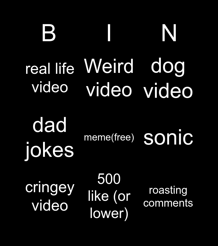 This bingo card has a free space and 8 words: sonic, dog video, Weird video, cringey video, real life video, roasting comments, dad jokes and 500 like (or lower).