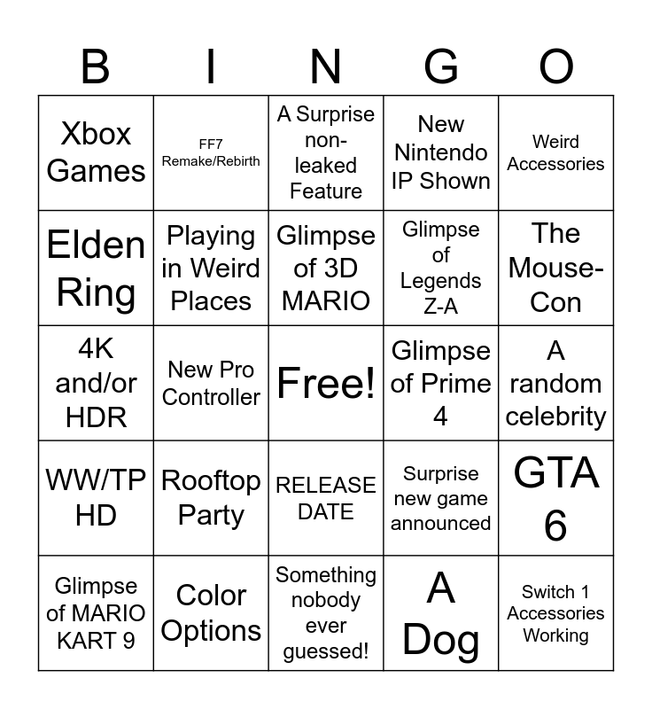 This bingo card has a free space and 24 words: Rooftop Party, Color Options, Glimpse of 3D MARIO, Glimpse of MARIO KART 9, Weird Accessories, Xbox Games, Elden Ring, FF7 Remake/Rebirth, Glimpse of Prime 4, RELEASE DATE, Glimpse of Legends Z-A, 4K and/or HDR, Surprise new game announced, GTA 6, Playing in Weird Places, A Dog, A random celebrity, A Surprise non-leaked Feature, The Mouse-Con, New Pro Controller, Switch 1 Accessories Working, WW/TP HD, New Nintendo IP Shown and Something nobody ever guessed!.