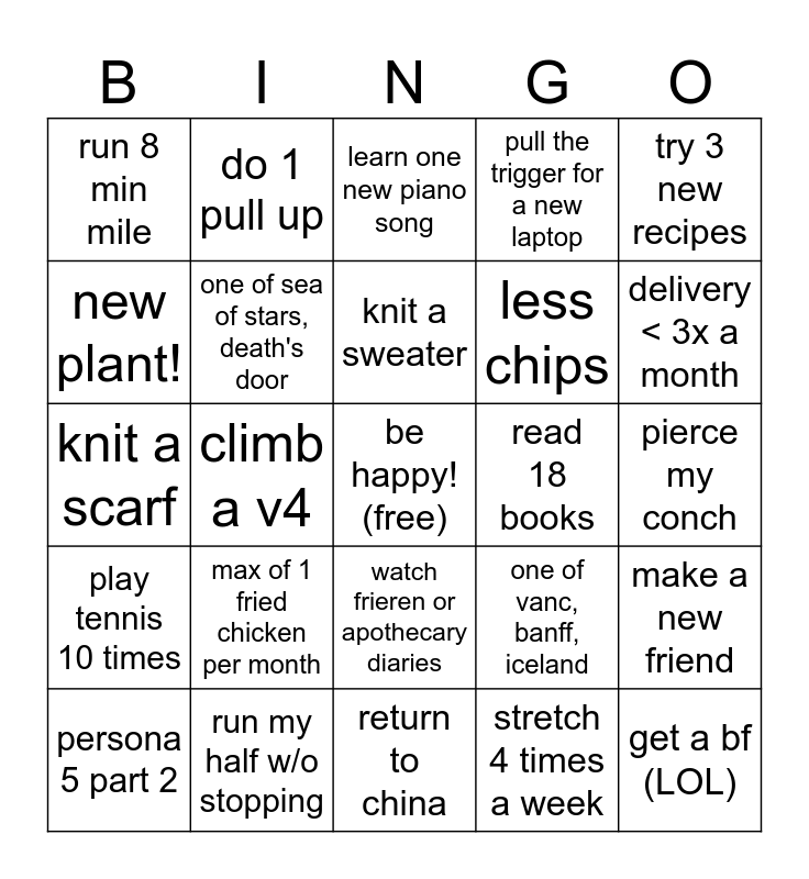This bingo card has a free space and 24 words: max of 1 fried chicken per month, run my half w/o stopping, knit a sweater, persona 5 part 2, try 3 new recipes, run 8 min mile, new plant!, do 1 pull up, read 18 books, watch frieren or apothecary diaries, less chips, knit a scarf, one of vanc, banff, iceland, make a new friend, one of sea of stars, death's door, stretch 4 times a week, pierce my conch, learn one new piano song, delivery < 3x a month, climb a v4, get a bf (LOL), play tennis 10 times, pull the trigger for a new laptop and return to china.