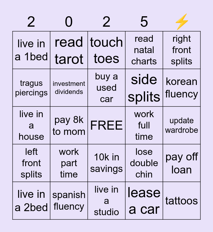 This bingo card has a free space and 24 words: work part time, spanish fluency, buy a used car, live in a 2bed, right front splits, live in a 1bed, tragus piercings, read tarot, work full time, 10k in savings, side splits, live in a house, lose double chin, pay off loan, investment dividends, lease a car, update wardrobe, touch toes, korean fluency, pay 8k to mom, tattoos, left front splits, read natal charts and live in a studio.