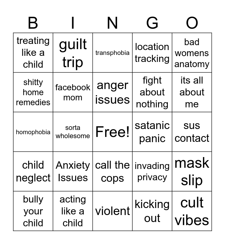 This bingo card has a free space and 24 words: Anxiety Issues, acting like a child, anger issues, bully your child, bad womens anatomy, treating like a child, shitty home remedies, guilt trip, satanic panic, call the cops, fight about nothing, homophobia, invading privacy, mask slip, facebook mom, kicking out, sus contact, transphobia, its all about me, sorta wholesome, cult vibes, child neglect, location tracking and violent.