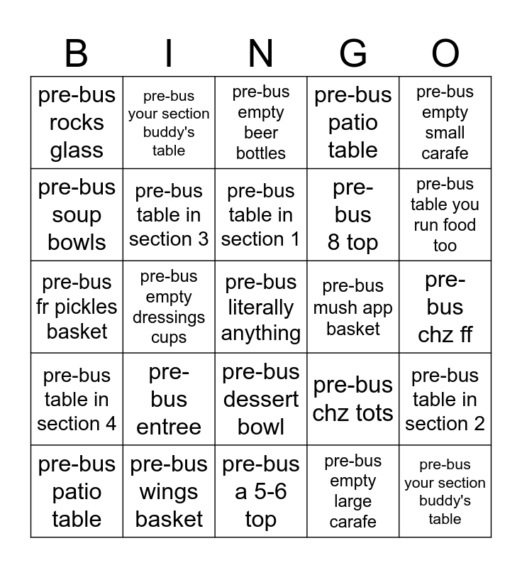 This bingo card has a free space and 24 words: pre-bus entree, pre-bus wings basket, pre-bus table in section 1, pre-bus patio table, pre-bus empty small carafe, pre-bus rocks glass, pre-bus soup bowls, pre-bus your section buddy's table, pre-bus mush app basket, pre-bus dessert bowl, pre-bus 8 top, pre-bus fr pickles basket, pre-bus chz tots, pre-bus table in section 2, pre-bus table in section 3, pre-bus empty large carafe, pre-bus chz ff, pre-bus empty beer bottles, pre-bus table you run food too, pre-bus empty dressings cups, pre-bus your section buddy's table, pre-bus table in section 4, pre-bus patio table and pre-bus a 5-6 top.