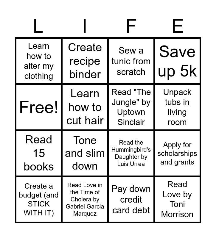 This bingo card has 16 words: Read Love in the Time of Cholera by Gabriel Garcia Marquez, Apply for scholarships and grants, Sew a tunic from scratch, Learn how to alter my clothing, Read 15 books, Create recipe binder, Read the Hummingbird's Daughter by Luis Urrea, Pay down credit card debt, Free!, Learn how to cut hair, Create a budget (and STICK WITH IT), Save up 5k, Tone and slim down, Unpack tubs in living room, Read "The Jungle" by Uptown Sinclair and Read Love by Toni Morrison.