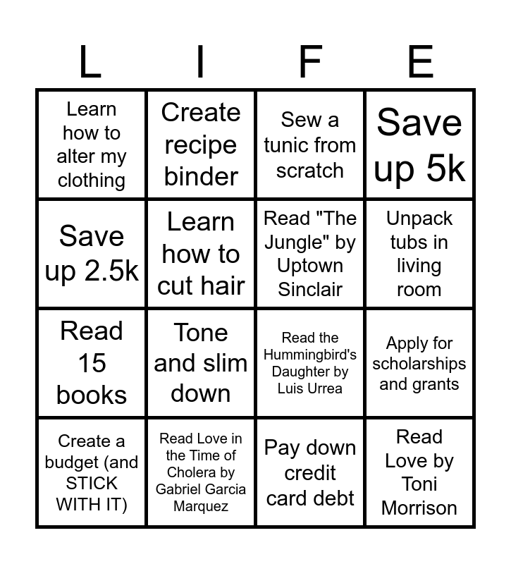 This bingo card has 16 words: Read Love in the Time of Cholera by Gabriel Garcia Marquez, Apply for scholarships and grants, Sew a tunic from scratch, Learn how to alter my clothing, Read 15 books, Create recipe binder, Read the Hummingbird's Daughter by Luis Urrea, Pay down credit card debt, Save up 2.5k, Learn how to cut hair, Create a budget (and STICK WITH IT), Save up 5k, Tone and slim down, Unpack tubs in living room, Read "The Jungle" by Uptown Sinclair and Read Love by Toni Morrison.