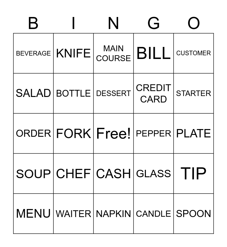 This bingo card has a free space and 24 words: CHEF, WAITER, DESSERT, MENU, CUSTOMER, BEVERAGE, SALAD, KNIFE, PEPPER, CASH, CREDIT CARD, ORDER, GLASS, TIP, BOTTLE, CANDLE, PLATE, MAIN COURSE, STARTER, FORK, SPOON, SOUP, BILL and NAPKIN.