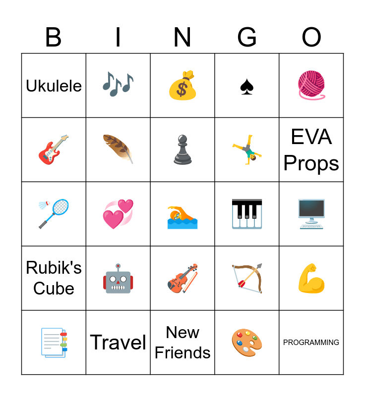 This bingo card has a free space and 24 words: π€, Travel, βοΈ, π, π§Ά, Ukulele, πΈ, πΆ, πΉ, π», π€ΈββοΈ, πΈ, πΉ, πͺ, πͺΆ, π¨, π₯οΈ, π°, EVA Props, π, PROGRAMMING, Rubik's Cube, β οΈ and New Friends.