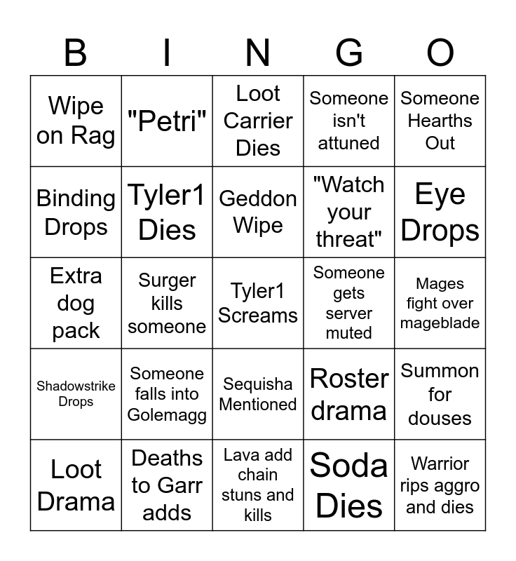 This bingo card has a free space and 24 words: Someone falls into Golemagg, Deaths to Garr adds, Geddon Wipe, Loot Drama, Someone Hearths Out, Wipe on Rag, Binding Drops, "Petri", Someone gets server muted, Sequisha Mentioned, "Watch your threat", Extra dog pack, Roster drama, Summon for douses, Tyler1 Dies, Soda Dies, Mages fight over mageblade, Loot Carrier Dies, Eye Drops, Surger kills someone, Warrior rips aggro and dies, Shadowstrike Drops, Someone isn't attuned and Lava add chain stuns and kills.