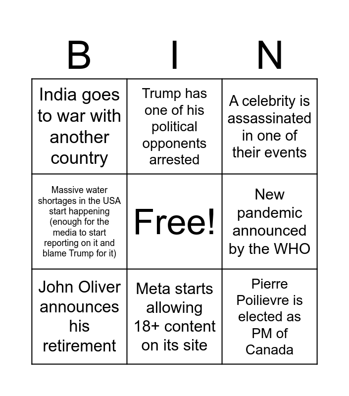 This bingo card has a free space and 8 words: New pandemic announced by the WHO, A celebrity is assassinated in one of their events, Trump has one of his political opponents arrested, John Oliver announces his retirement, India goes to war with another country, Pierre Poilievre is elected as PM of Canada, Massive water shortages in the USA start happening (enough for the media to start reporting on it and blame Trump for it) and Meta starts allowing 18+ content on its site.
