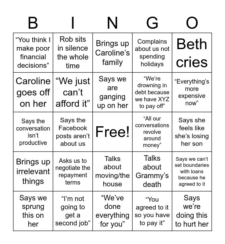 This bingo card has a free space and 24 words: Asks us to negotiate the repayment terms, “I’m not going to get a second job”, Says we are ganging up on her, Says we sprung this on her, Beth cries, “You think I make poor financial decisions”, Caroline goes off on her, Rob sits in silence the whole time, “All our conversations revolve around money”, Talks about moving/the house, “We’re drowning in debt because we have XYZ to pay off”, Says the conversation isn’t productive, Talks about Grammy’s death, Says we can’t set boundaries with loans because he agreed to it, “We just can’t afford it”, “You agreed to it so you have to pay it”, Says she feels like she’s losing her son, Brings up Caroline’s family, “Everything’s more expensive now”, Says the Facebook posts aren’t about us, Says we’re doing this to hurt her, Brings up irrelevant things, Complains about us not spending holidays and “We’ve done everything for you”.
