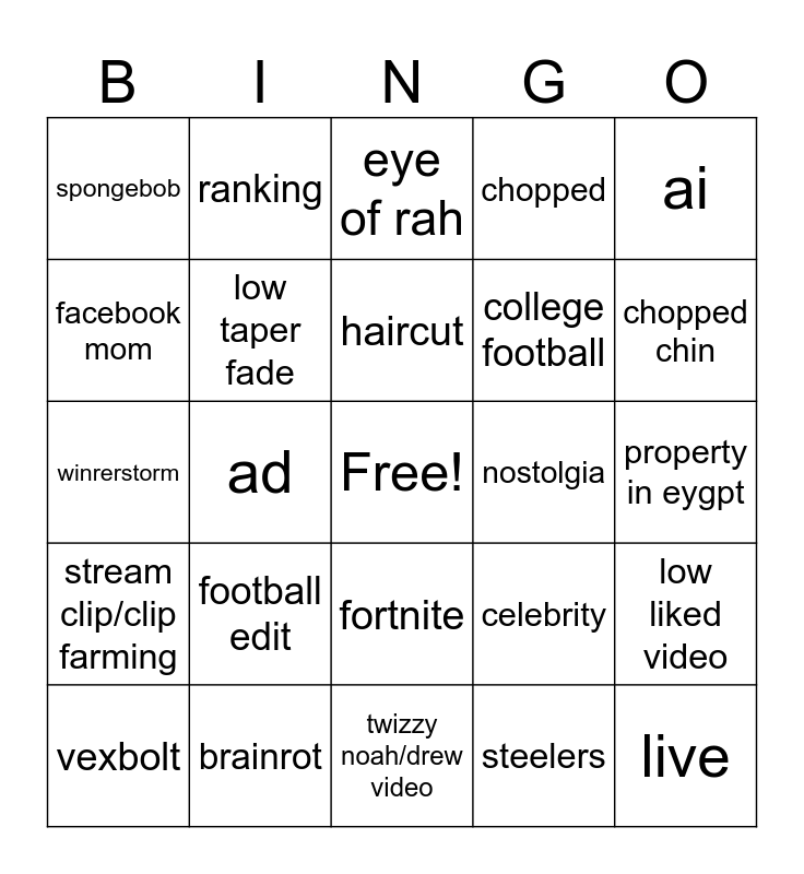 This bingo card has a free space and 24 words: football edit, brainrot, haircut, vexbolt, ai, spongebob, facebook mom, ranking, nostolgia, fortnite, college football, winrerstorm, celebrity, low liked video, low taper fade, steelers, property in eygpt, eye of rah, chopped chin, ad, live, stream clip/clip farming, chopped and twizzy noah/drew video.