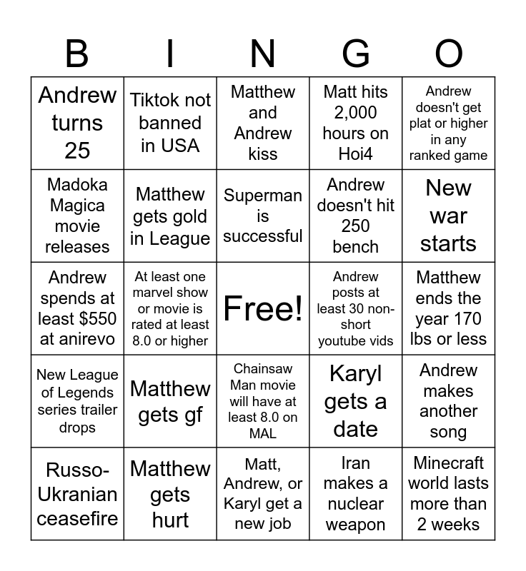 This bingo card has a free space and 24 words: Matthew gets gf, Matthew gets hurt, Superman is successful, Russo-Ukranian ceasefire, Andrew doesn't get plat or higher in any ranked game, Andrew turns 25, Madoka Magica movie releases, Tiktok not banned in USA, Andrew posts at least 30 non-short youtube vids, Chainsaw Man movie will have at least 8.0 on MAL, Andrew doesn't hit 250 bench, Andrew spends at least $550 at anirevo, Karyl gets a date, Andrew makes another song, Matthew gets gold in League, Iran makes a nuclear weapon, Matthew ends the year 170 lbs or less, Matthew and Andrew kiss, New war starts, At least one marvel show or movie is rated at least 8.0 or higher, Minecraft world lasts more than 2 weeks, New League of Legends series trailer drops, Matt hits 2,000 hours on Hoi4 and Matt, Andrew, or Karyl get a new job.