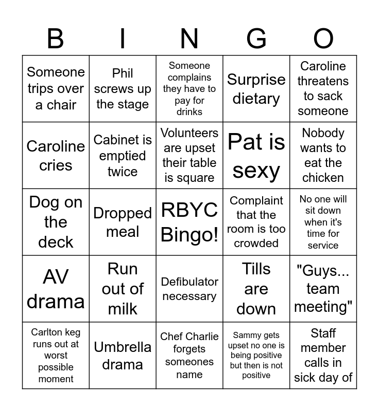 This bingo card has a free space and 39 words: Medical emergency, Someone cries, More than 5 extras show up, Cabinet is emptied twice, Carlton keg runs out at worst possible moment, Defibulator necessary, Volunteers are upset their table is square, All customers show up early, Caroline threatens to sack someone, AV drama, Dropped meal, Surprise dietary, Staff member calls in sick day of, No one will sit down when it's time for service, Complaint that the room is too crowded, Run out of milk, Maddy is late, Someone trips over a chair, Sailing delayed, Tills are down, Caroline cries, Chef Charlie forgets someones name, Pat is sexy, Nobody wants to eat the chicken, Go to wrong table with meals, Sammy has a breakdown of some sort, Sammy or Caro cracks it at Angus, Caro says "one team one dream etc." at least 5 times, M.C. says something weird, Phil screws up the stage, Maddy and pat don't get out until midnight, Till breaks, Someone complains they have to pay for drinks, Umbrella drama, Sammy gets upset no one is being positive but then is not positive, Walkie talkie drama, "Guys... team meeting", Dog on the deck and Someone shows up in the wrong uniform.