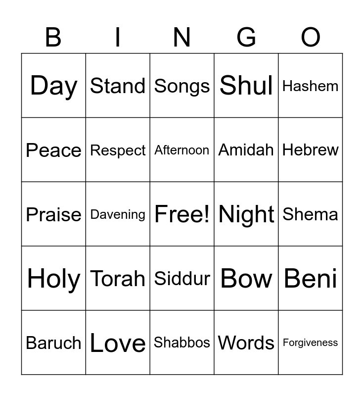 This bingo card has a free space and 24 words: Baruch, Torah, Afternoon, Words, Hashem, Day, Stand, Songs, Night, Shema, Praise, Respect, Bow, Beni, Peace, Love, Shabbos, Shul, Hebrew, Holy, Davening, Siddur, Amidah and Forgiveness.