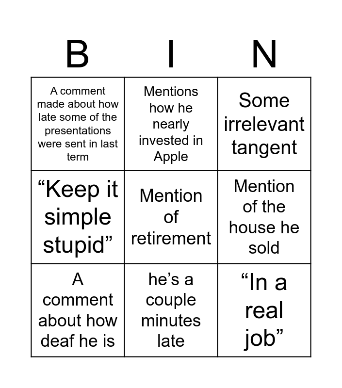This bingo card has a free space and 8 words: Mention of the house he sold, Some irrelevant tangent, Mentions how he nearly invested in Apple, A comment about how deaf he is, A comment made about how late some of the presentations were sent in last term, “In a real job”, “Keep it simple stupid” and he’s a couple minutes late.