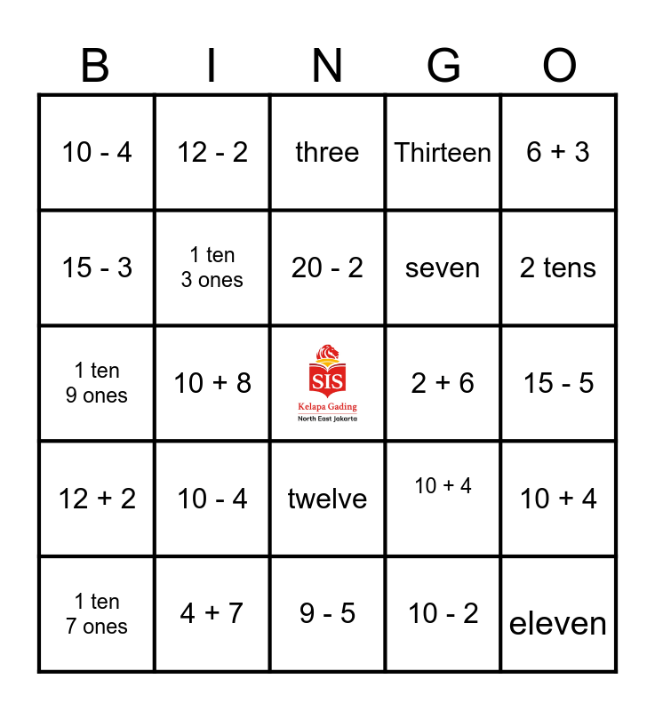 This bingo card has a free space and 24 words: 10 - 4, 4 + 7, 20 - 2, 1 ten 7 ones, 6 + 3, 10 - 4, 15 - 3, 12 - 2, 2 + 6, twelve, seven, 1 ten 9 ones, 10 + 4, 10 + 4, 1 ten 3 ones, 10 - 2, 15 - 5, three, 2 tens, 10 + 8, eleven, 12 + 2, Thirteen and 9 - 5.