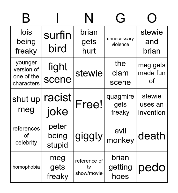 This bingo card has a free space and 24 words: peter being stupid, meg gets freaky, stewie, homophobia, stewie and brian, lois being freaky, younger version of one of the characters, surfin bird, quagmire gets freaky, giggty, the clam scene, shut up meg, evil monkey, death, fight scene, brian getting hoes, stewie uses an invention, brian gets hurt, meg gets made fun of, racist joke, pedo, references of celebrity, unnecessary violence and reference of tv show/movie.