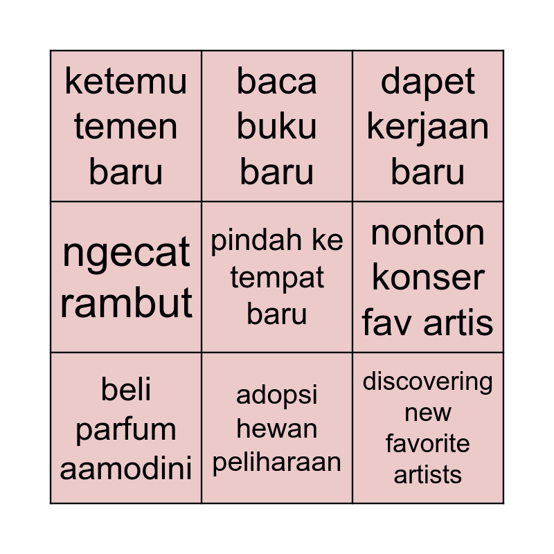This bingo card has a free space and 8 words: nonton konser fav artis, dapet kerjaan baru, baca buku baru, beli parfum aamodini, ketemu temen baru, discovering new favorite artists, ngecat rambut and adopsi hewan peliharaan.