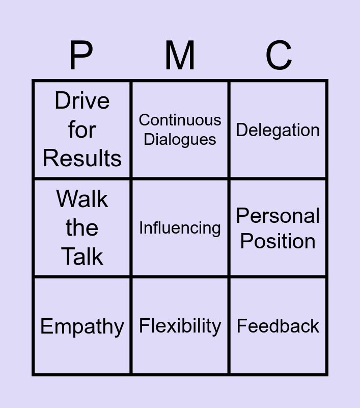 This bingo card has 24 words: Accountability, Managing Conflicts, Flexibility, Motivation, Influencing, Drive for Results, Personal Position, Continuous Dialogues, Informal Feedback, Building Trust, Feedback, Decision Making, Appreciation, Emotional Intelligence, Empathy, Recognition, Growth Mindset, Delegation, Active Listening, Performance Management, Power Position, Effective Communication, Walk the Talk and Difficult Conversations.