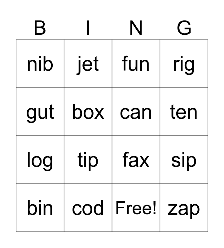 This bingo card has 17 words: Free!, bin, fun, nib, tip, rig, sip, can, ten, box, cod, fax, gut, jet, log, set and zap.