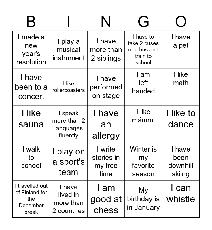 This bingo card has a free space and 24 words: I play on a sport's team, I have lived in more than 2 countries, I have performed on stage, I travelled out of Finland for the December break, I have a pet, I made a new year's resolution, I have been to a concert, I play a musical instrument, I like mämmi, I write stories in my free time, I am left handed, I like sauna, Winter is my favorite season, I have been downhill skiing, I like rollercoasters, My birthday is in January, I like to dance, I have more than 2 siblings, I like math, I speak more than 2 languages fluently, I can whistle, I walk to school, I have to take 2 buses or a bus and train to school and I am good at chess.