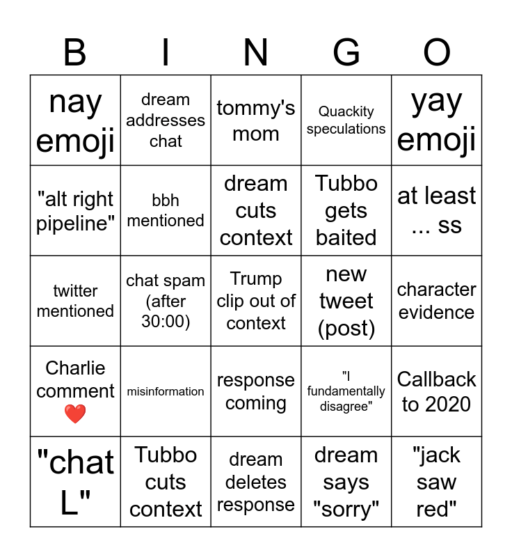 This bingo card has a free space and 24 words: misinformation, Tubbo cuts context, dream cuts context, "chat L", yay emoji, nay emoji, "alt right pipeline", dream addresses chat, new tweet (post), response coming, Tubbo gets baited, twitter mentioned, "I fundamentally disagree", Callback to 2020, bbh mentioned, dream says "sorry", character evidence, tommy's mom, at least ... ss, chat spam (after 30:00), "jack saw red", Charlie comment❤️, Quackity speculations and dream deletes response.