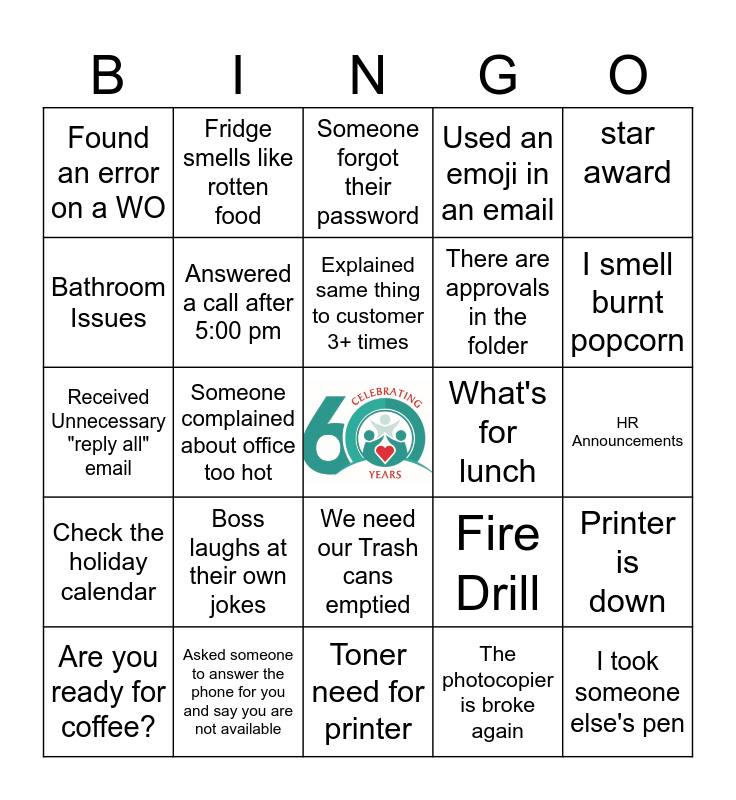 This bingo card has a free space and 35 words: 30+ query emails in 1 day, Added paper to printer, Sports and social, Answered a call after 5:00 pm, We need our Trash cans emptied, Used an emoji in an email, Bathroom Issues, Someone complained about office too cold, Explained same thing to customer 3+ times, Answered phone and someone hung up, Received Unnecessary "reply all" email, star award, Reset Password, Internet went down, Found an error on a WO, What's for lunch, The photocopier is broke again, Someone complained about office too hot, Check the holiday calendar, I took someone else's pen, Fire Drill, Are you ready for coffee?, Printer is down, Asked someone to answer the phone for you and say you are not available, Someone forgot their password, I smell burnt popcorn, RSVP for In - Service, Inventory is 10/17/23, There are approvals in the folder, HR Announcements, Someone complained about office too hot, Toner need for printer, Boss laughs at their own jokes, Fridge smells like rotten food and Meeting that should have been an email.