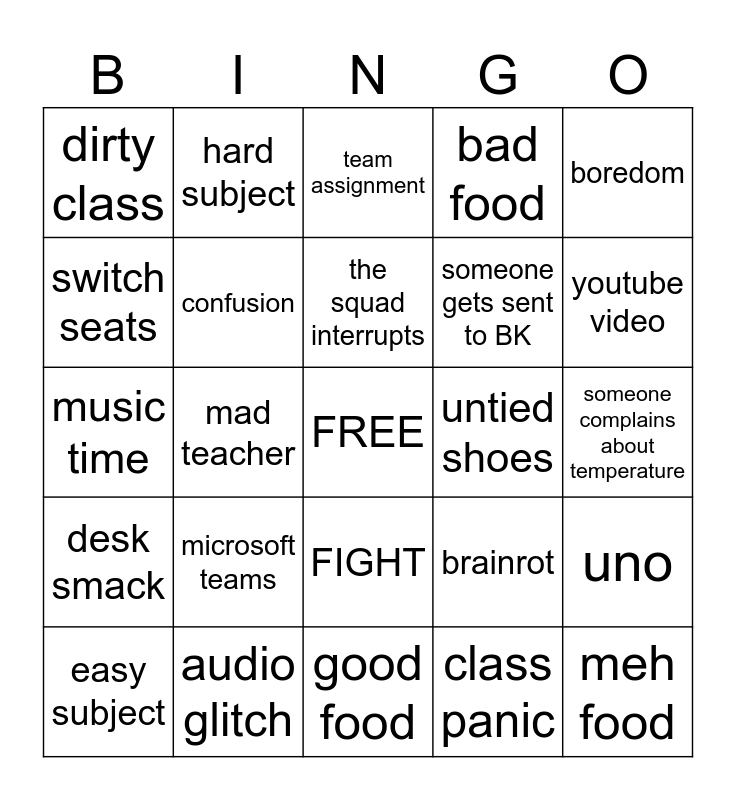 This bingo card has a free space and 34 words: loud ahh class, class panic, ship, someone is late, desk smack, confusion, boredom, easy subject, hard subject, english word in a non-english subject, the squad interrupts, team assignment, phones during class, we go outside, untied shoes, youtube video, audio glitch, music time, microsoft teams, brainrot, FIGHT, i dropped my pencil, dirty class, someone complains about temperature, good food, meh food, bad food, silent ahh class, someone gets sent to BK, switch seats, someone forgot their book, mad teacher, uno and full board.