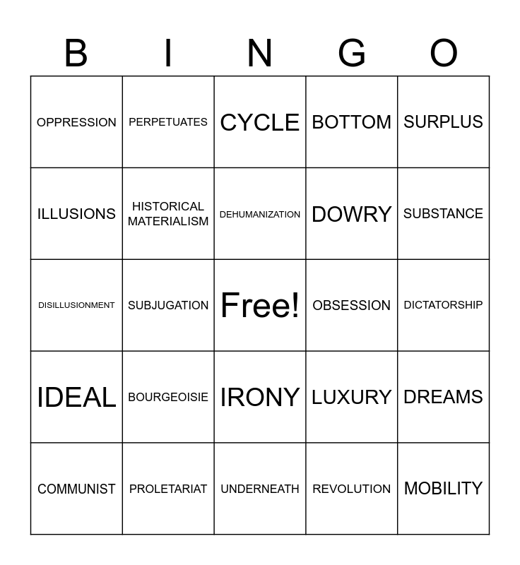 This bingo card has a free space and 24 words: BOURGEOISIE, PROLETARIAT, DEHUMANIZATION, COMMUNIST, SURPLUS, OPPRESSION, ILLUSIONS, PERPETUATES, OBSESSION, IRONY, DOWRY, DISILLUSIONMENT, LUXURY, DREAMS, HISTORICAL MATERIALISM, REVOLUTION, DICTATORSHIP, CYCLE, SUBSTANCE, SUBJUGATION, MOBILITY, IDEAL, BOTTOM and UNDERNEATH.