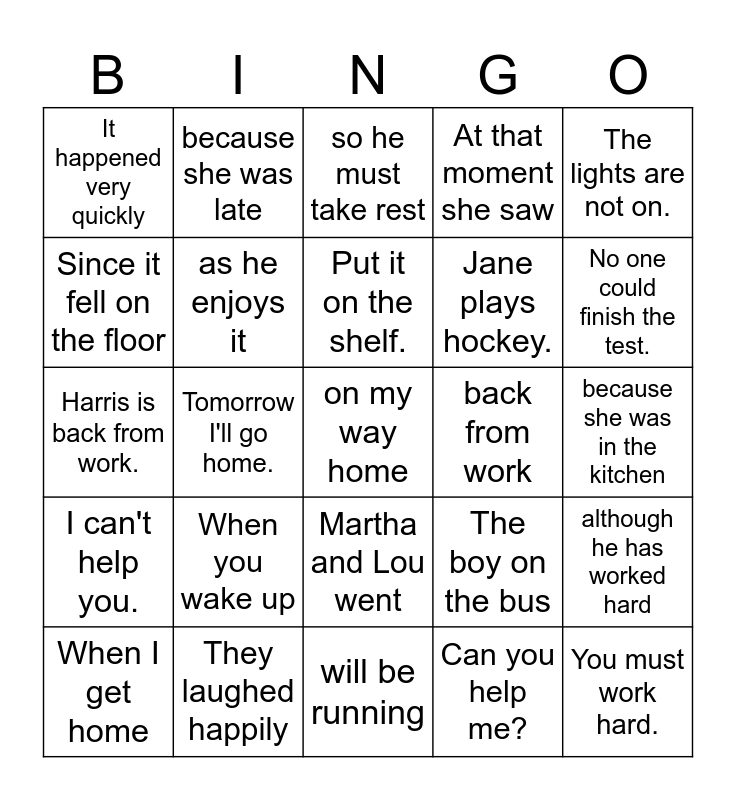 This bingo card has 25 words: When you wake up, will be running, Put it on the shelf., When I get home, The lights are not on., It happened very quickly, Since it fell on the floor, because she was late, back from work, Martha and Lou went, Jane plays hockey., Harris is back from work., The boy on the bus, although he has worked hard, as he enjoys it, You must work hard., because she was in the kitchen, so he must take rest, No one could finish the test., Tomorrow I'll go home., on my way home, They laughed happily, I can't help you., At that moment she saw and Can you help me?.