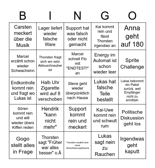 This bingo card has 25 words: Hendrik "kann nicht mehr", Thorsten erzählt eine neue Verschwörungstheorie, Marcel schreit Flo mit "ENDTEST!" an, Gogo stellt alles in Frage, Anna geht auf 180, Carsten meckert über die Musik, Marcel erzählt schon wieder Schwachsinn, Lager liefert wieder falsche Ware, Lukas hat falsche Teile bestellt, Support kommt rein und meckert, Energy im Automat ist schon wieder leer, Endkontrolle kommt rein und fragt wo Lukas ist, Kai-Uwe kommt rein und schwult rum, Politische Diskussion geht los, Thorsten fragt sich wo sein Akkuschrauber ist, Irgendwas geht kaputt, Lukas bekommt ein Paket zurück, weil Empfänger nicht zu ermitteln, Support hat was falsch oder nicht gemacht, Sprite Challenge, Halb Uhr Zigarette wird auf 8 verschoben, Steve geht wieder überpünktlich nach Hause, Thorsten sagt "Früher war alles besser" o.Ä, Sören kommt rein und will wieder übers Kiffen reden, Kai kommt rein und fässt Thorsten irgendwo an and Lukas sagt nein zu Rauchen.